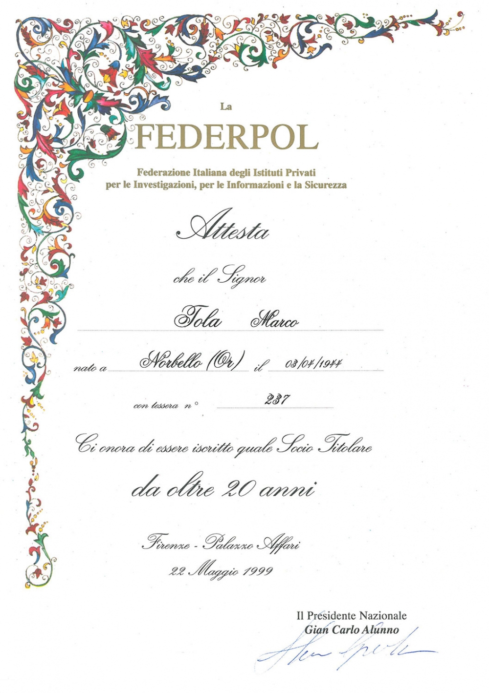 Tola Marco - Riconoscimento in qualità di Socio Titolare dell'associazione da oltre 20 anni